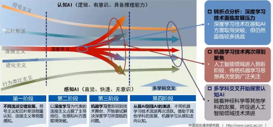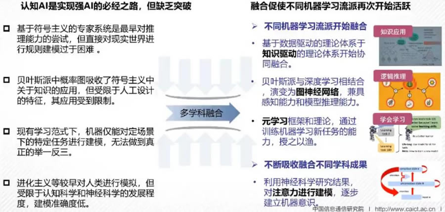 雖然AI已經(jīng)廣泛用于日常生活中,但當(dāng)前仍然處于弱AI階段,強AI“道艱且長”。認(rèn)知AI是實現(xiàn)強AI的必經(jīng)之路,但缺乏突破,融合不同機器學(xué)習(xí)流派開始活躍。