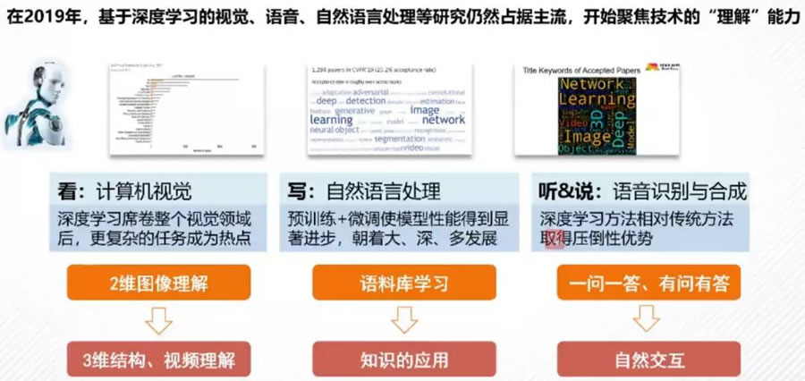 在2019年,基于深度學(xué)習(xí)的視覺、語音、自然語言處理等研究仍占據(jù)主流,人們開始聚焦技術(shù)的“理解”。