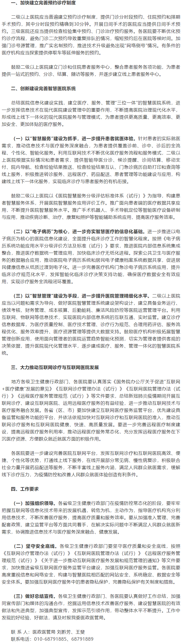近年來,為改善人民群眾就醫體驗,各地不斷推進以電子病歷為核心的醫院信息化建設,創新發展智慧醫院、互聯網醫院,建立完善預約診療制度等改善醫療服務工作。新G肺炎疫情期間,智慧醫院和互聯網醫院建設、預約診療等改善醫療服務成果,在應對疫情、滿足人民群眾就醫需求等方面發揮了積J作用。為持續鞏固疫情防控成果和改善醫療服務,加快推進線上線下一體化的醫療服務新模式,不斷增強人民群眾就醫獲得感,現就進一步建立完善預約診療制度,加強智慧醫院建設等有關工作通知如下: