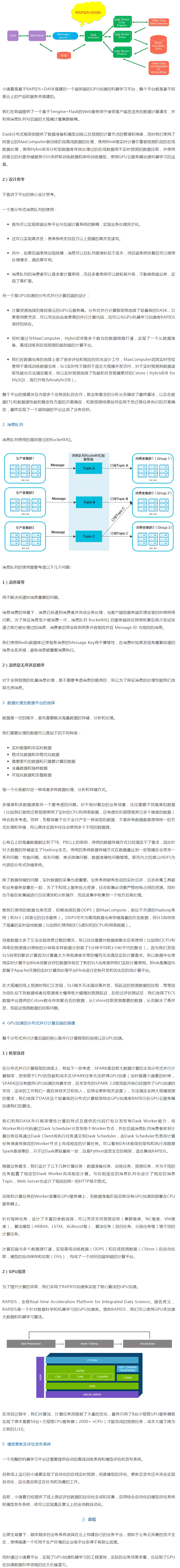 整個平臺包含:Web服務、MQ消息隊列、Redis數據庫、SLS/MaxComputer/HybridDB數據獲取、OSS模型倉庫的上傳下載、GPU云服務器、DASK分布式框架、RAPIDS加速庫。