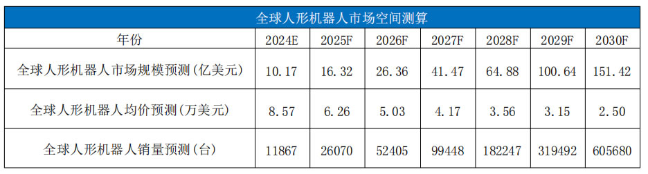 G工機器人產業研究所(GGII) 通過測算人形機器人在不同L域的滲透率預測,2024年人形機器人市場規模為10.17億美元, 到2030年人形機器人市場規模將達到151億美元,2024-2030年CAGR 將超過56%,人形機器人銷量將從1.19萬臺增長至 60.57萬臺。
