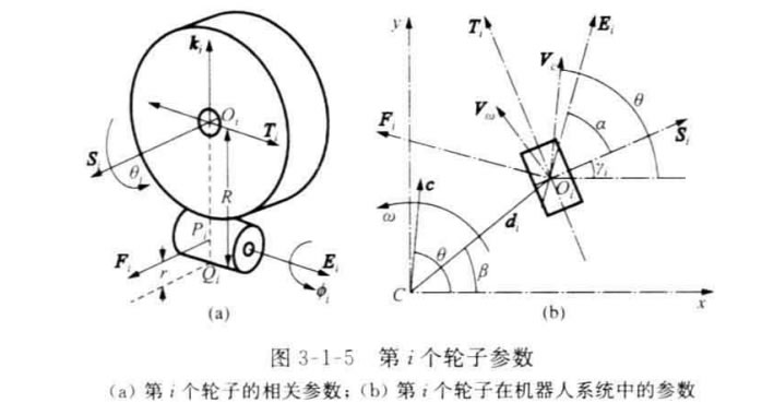 具有傳統(tǒng)車輪的機(jī)器人只能有兩個自由度的運動,所以在運動學(xué)上,它等價于 傳統(tǒng)的陸上車輛。然而,具有全方位輪的機(jī)器人有3個自由度運動的能力,即沿著 平面上x 軸、y 軸以及繞自身中心旋轉(zhuǎn)的運動能力,這充分增加了機(jī)器人的機(jī)動 性。本節(jié)將給出這種全方位移動機(jī)器人的運動學(xué)模型。