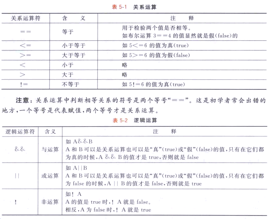 我們先來看看什么是條件表達式。簡單地說,條件表達式是一個結果值只可能為 “真”(true) 或“假”(false) 的計算式。它們可以分為兩種: 一種叫關系運算;另一種叫邏輯 運算。關系運算主要用來判斷值的大小關系,比如判斷a 和 b 是否相等,或是判斷c 和 d 誰大誰小。而使用邏輯運算可以把幾個關系運算連接起來,表達更復雜的邏輯,比如,“a 大于b, 而 且c 大 于d” 這個式子是真還是假?我們把Z常用的這類運算總結在表5-1和 表5-2中。