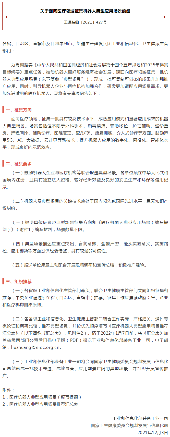 為貫徹落實《中華人民共和國國民經濟和社會發展第十四個五年規劃和2035年遠景目標綱要》重點任務,推動機器人更好服務經濟社會發展,現面向醫療L域征集一批機器人典型應用場景(以下簡稱“典型場景”),形成一批可復制可借鑒的成果并加強推廣應用。同時,引導機器人企業與醫療機構加強合作,研發更加適配應用場景需求、更加先進適用的醫療機器人。