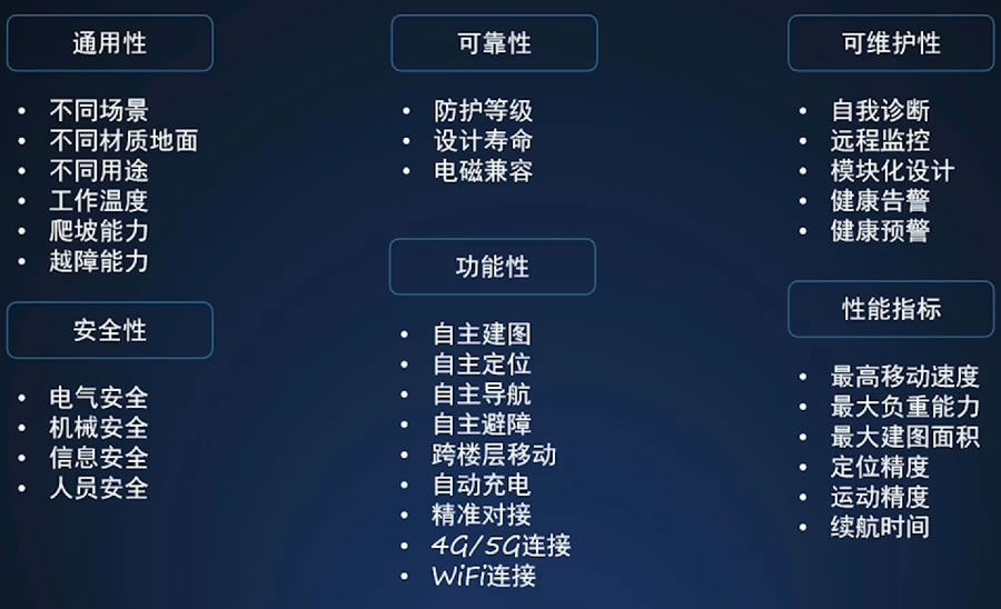 1 通用性:不同場(chǎng)景、不同材質(zhì)地面、不同用途、工作溫度、爬坡能力、越障能力。