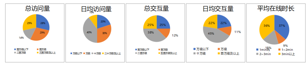 從訪問量上看,超七成產(chǎn)品的總訪問量達(dá)到了百萬級,其中總訪問量超過二百萬和三百萬的產(chǎn)品約占三成;從日均訪問量上看,約70%的產(chǎn)品日均訪問量在一萬到二十萬之間,僅有10%的產(chǎn)品突破了二十萬大關(guān);從交互量上看,約75%的產(chǎn)品總交互量超過了百萬條,約78%的產(chǎn)品日均交互量超過一萬條;從用戶平均在線時長上來看,超五成產(chǎn)品達(dá)到了2分鐘以上,約37%的產(chǎn)品用戶平均在線時長不足1分鐘,另外平均在線時長超過3分鐘的產(chǎn)品數(shù)約占36%。